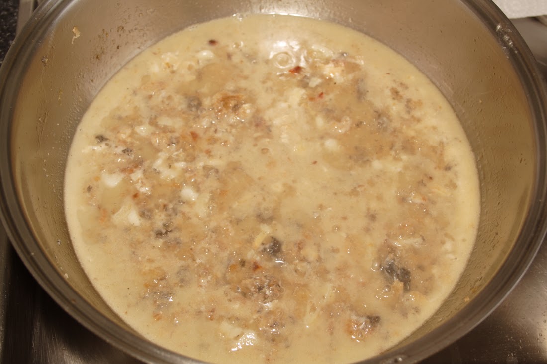 En la misma olla, si hay poco aceite añadiremos un poco mas, ponemos los ajos laminados. Cuando se doren añadimos la cayena y el resto del vino blando (150 gr). En el fondo de la olla se nos habrán quedado restos de la corvina, no importa, al añadir el vino y con la ayuda de una espátula de madera, los iremos quitando. Esto le dará buen sabor a la salsa.