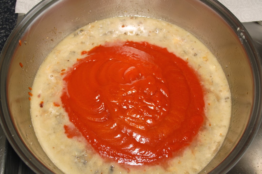 Dejamos que hierva todo este líquido unos 30 segundos, añadimos el tomate frito deseado para la salsa y dejamos reducir un poco. Echamos el líquido de los mejillones y removemos.