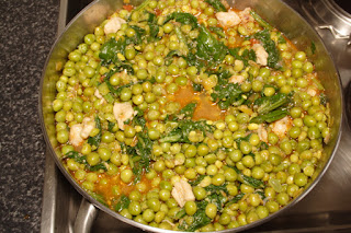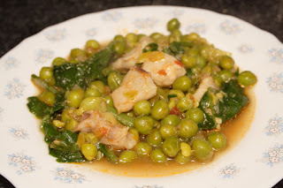 Esta receta es de «cosecha propia». Hace unos días compré un pulpo entero, grande y como la cabeza no me atrae demasiado para hacerla «a feira», la congelé y se me ocurrió ponerla así. La verdad es que le da un punto a los guisantes, lo mismo que las acelgas.