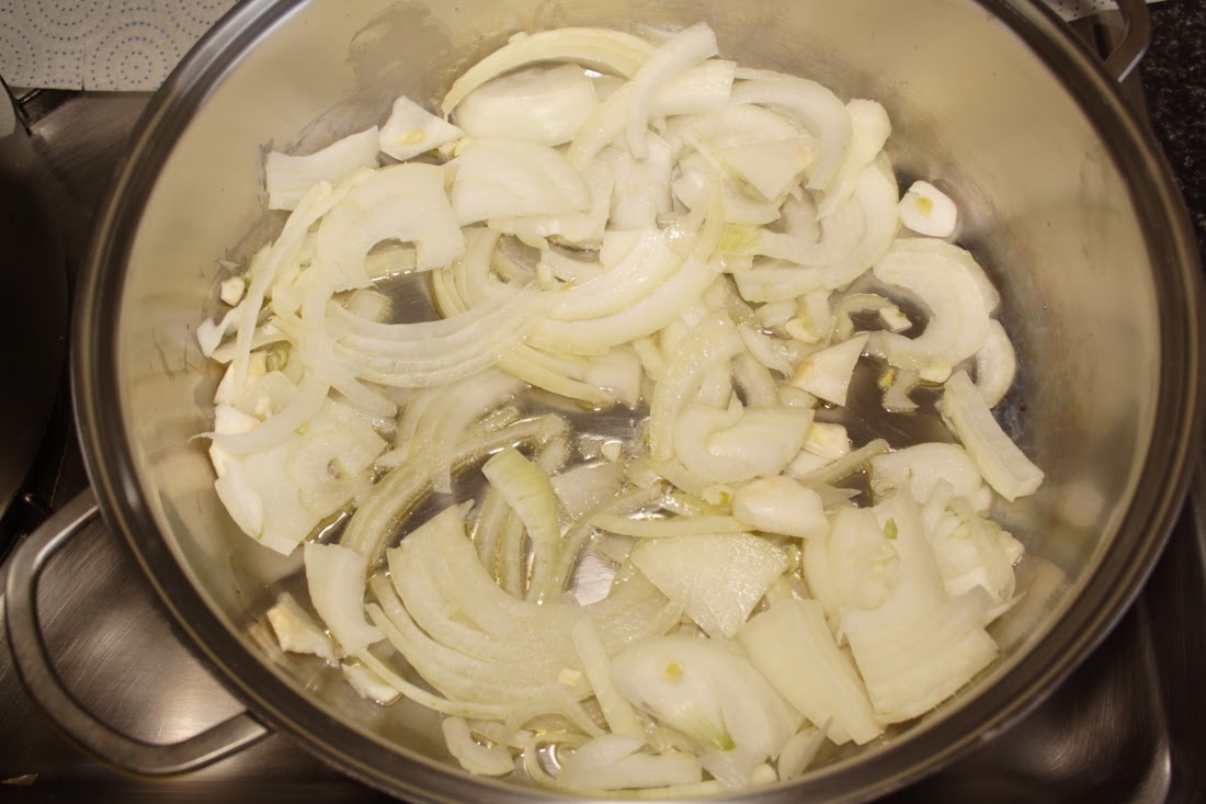 Pelamos y partimos la cebolla y el ajo en trozos pequeños y los ponemos en una olla con aceite de oliva y la cayena. Vamos removiendo y cuando la cebolla se quede transparente, retiramos del fuego y reservamos.