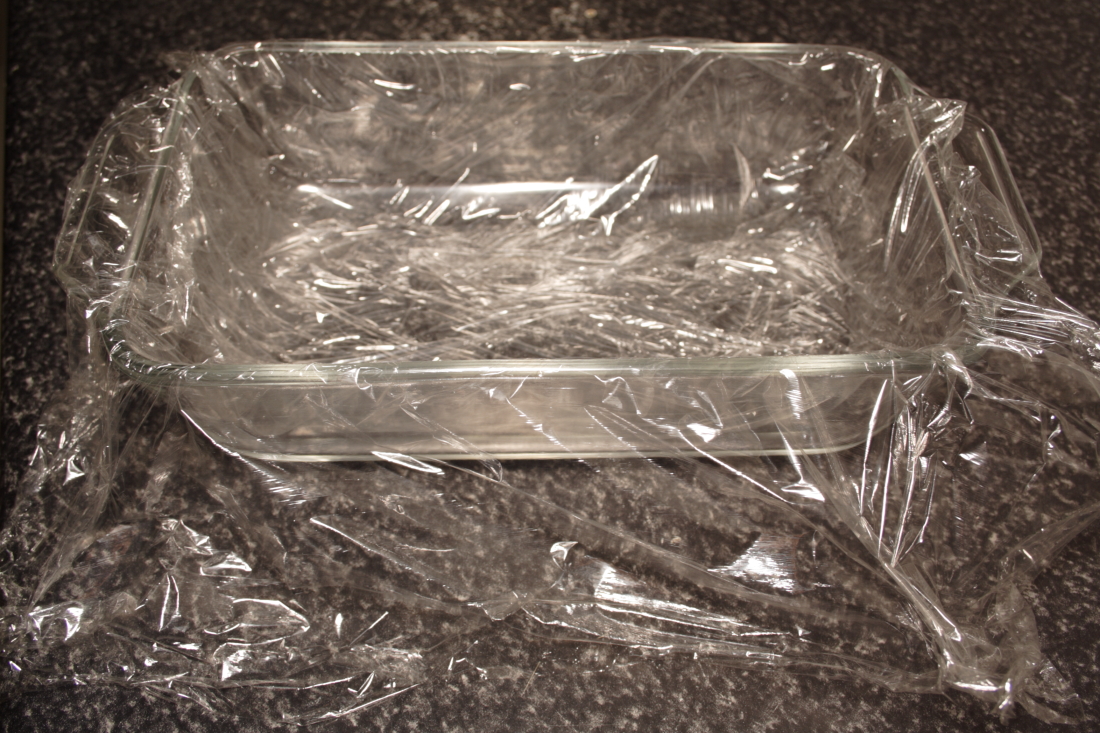 Yo he elegido un molde rectangular, que he forrado con film, dejando sobrante para tapar nuestro milhojas para meterlo en la nevera. Reservamos.