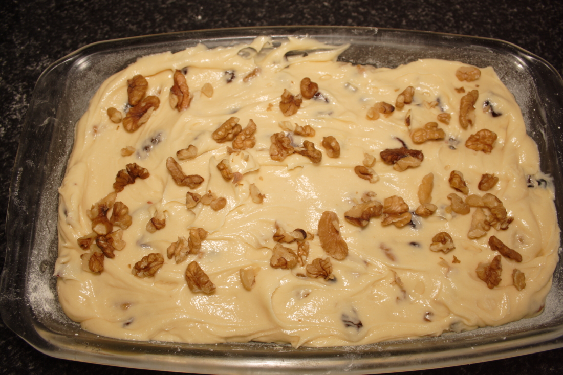 Removemos todo bien, que se unan los ingredientes y pasamos esta masa al molde, repartimos bien, procuramos dejarlo liso por encima y echamos las nueces que hemos reservado de forma arbitraria.