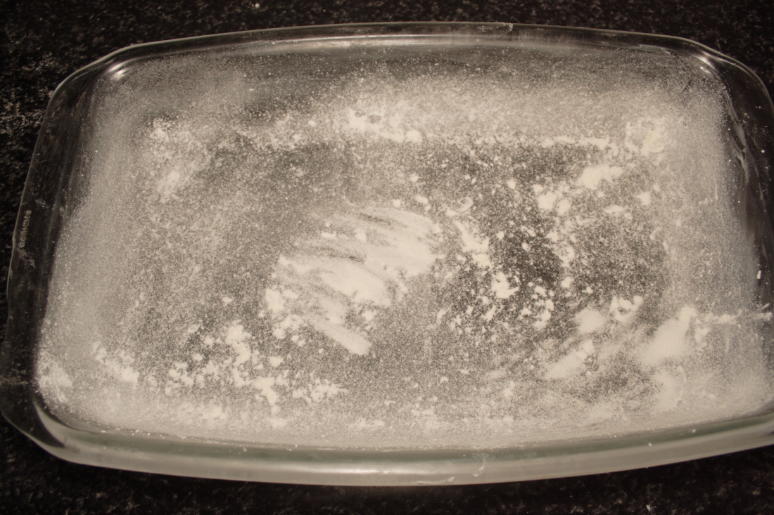 Escogemos un molde, yo he puesto uno de cristal rectangular, untamos con mantequilla y espolvoreamos con harina, retirando bien la que nos sobre. Reservamos.
