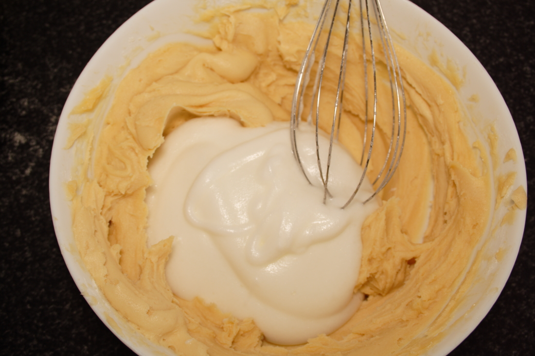 En un bol grande ponemos la mantequilla un poco blanda (la podemos meter 30 segundos en el microondas), no derretida. batimos con las varillas de la batidora hasta que emulsione, añadimos poco a poco parte del azúcar glas (100 gr) y seguimos batiendo, incorporamos las yemas, seguimos batiendo hasta conseguir una crema y añadimos la harina. Cuesta un poco batir, pero hay que tener paciencia. Yo acabé batiendo todo con la batidora, para que fuera mas fácil.