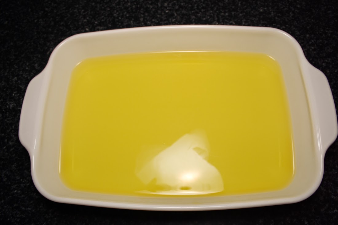 Una vez cuajado, repetimos el proceso con otro de los sobres, el de piña. Lo haremos el jueves por la mañana. Para verterlo sobre lo cuajado, hay que hacerlo con mucho cuidado, poner una cuchara y verter el líquido caliente sobre ella, como si fuera una cascada, con el fin de que no se mezcle con el que esta ya cuajado.
