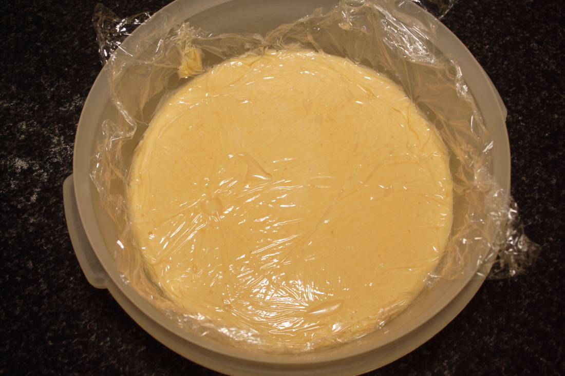 Removemos para que se mezcle bien todo y lo pasamos a: Como no tengo heladera ni cubitera que cierre herméticamente, lo paso a un tupper, dejo que se atempere, lo tapo con film, de forma que quede pegado a la superficie para que no forme costra, y cierro bien con la tapa.