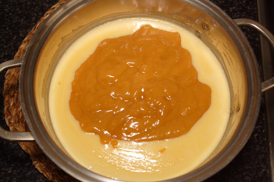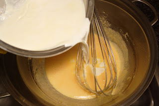 Vertemos, muy lentamente, la leche sobre las yemas, sin dejar de remover. Pasamos toda esta crema a una olla o cazo y lo seguimos calentando hasta que hierva y espese un poco. Retiramos del fuego y reservamos.