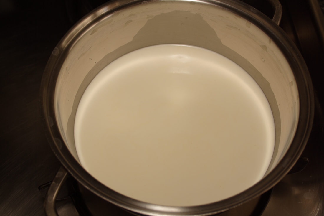 Preparación:En un cazo ponemos a calentar la leche y la nata, retiramos del fuego cuando rompa a hervir. Reservamos.