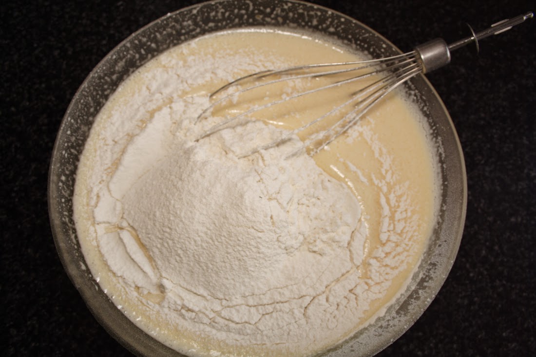Agregar la harina tamizada con un colador junto con la levadura, la ralladura de naranja y la sal. Mezclar lo justo con las varillas.
