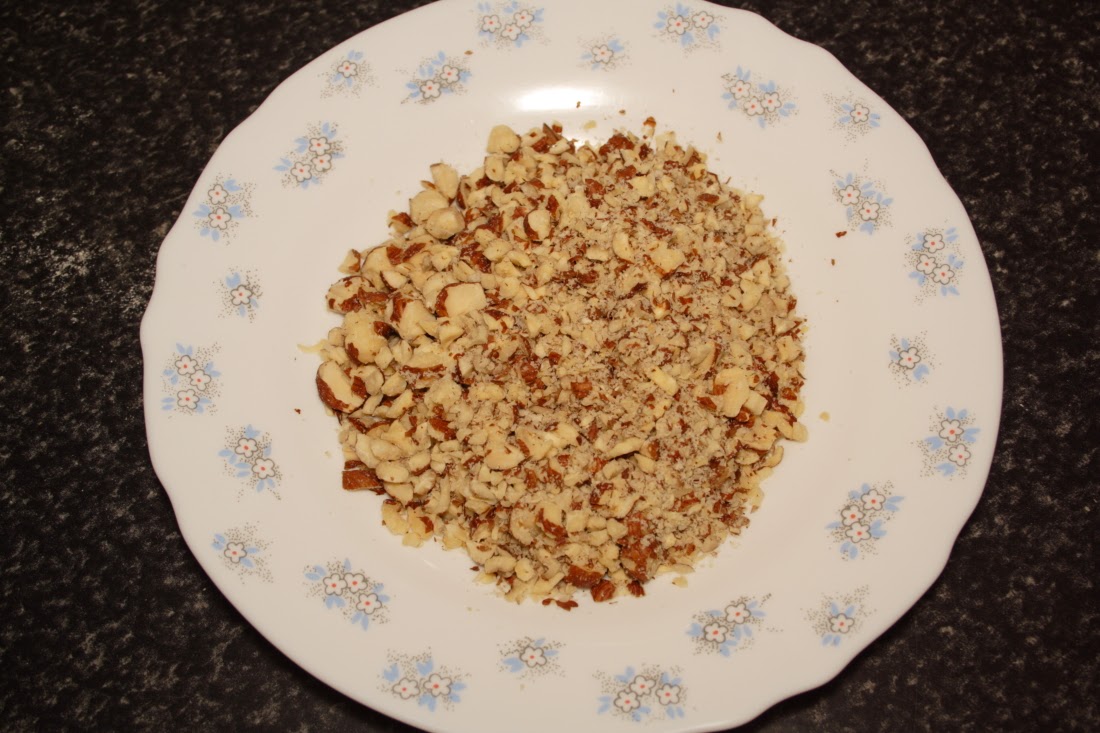Trituramos las avellanas para la decoración (con un aparato para esos menesteres), de forma que no queden demasiado finas, pues al hornearse quedan crujientes. Reservamos.