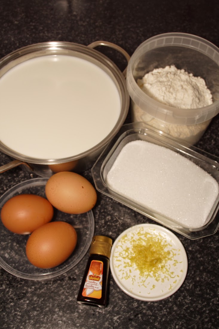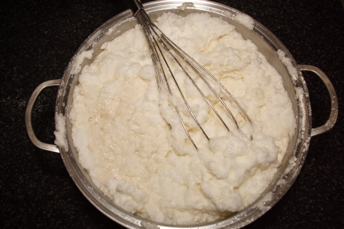 Añadir la mantequilla fundida y seguir batiendo, echamos ahora la esencia de vainilla y el litro de leche tibia y mezclamos con varilla manual, añadimos poco a poco la harina tamizada y seguimos batiendo hasta que quede una masa homogénea.