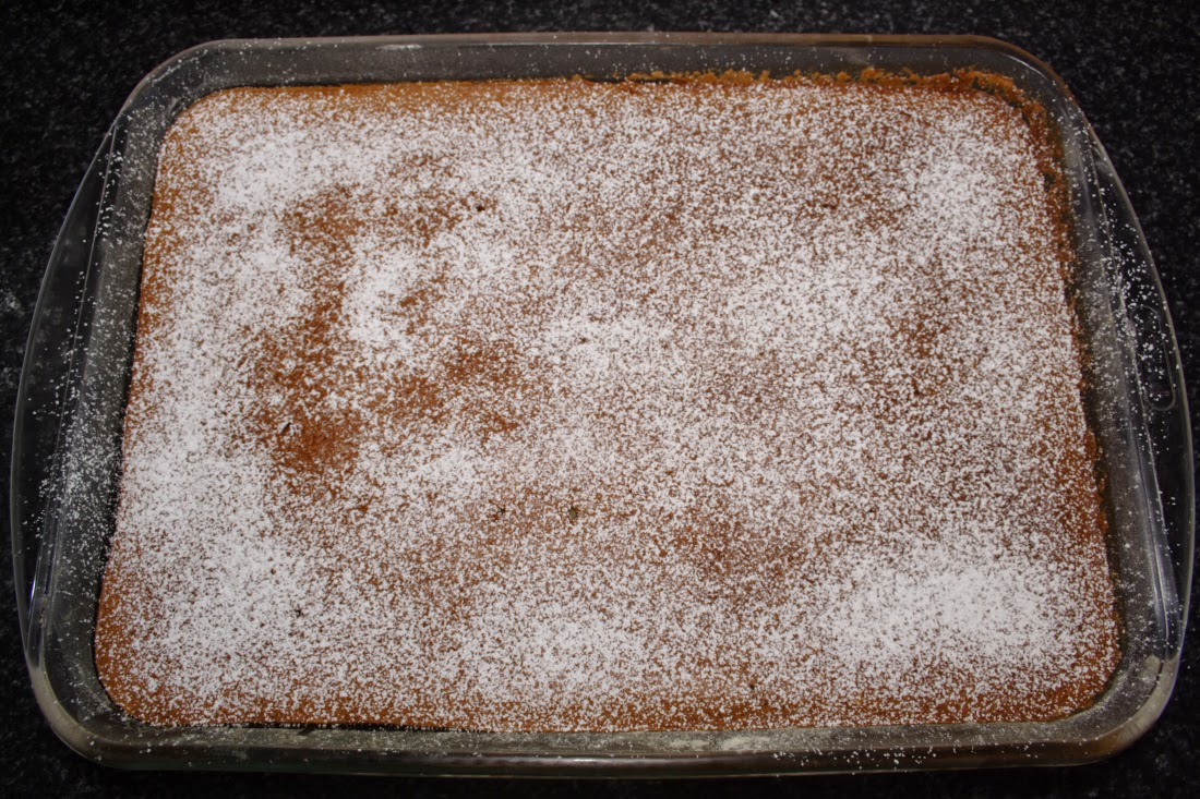 Este pastel se deja enfriar en el molde, no se desmolda, cuando este frío espolvoreamos con azúcar glas.