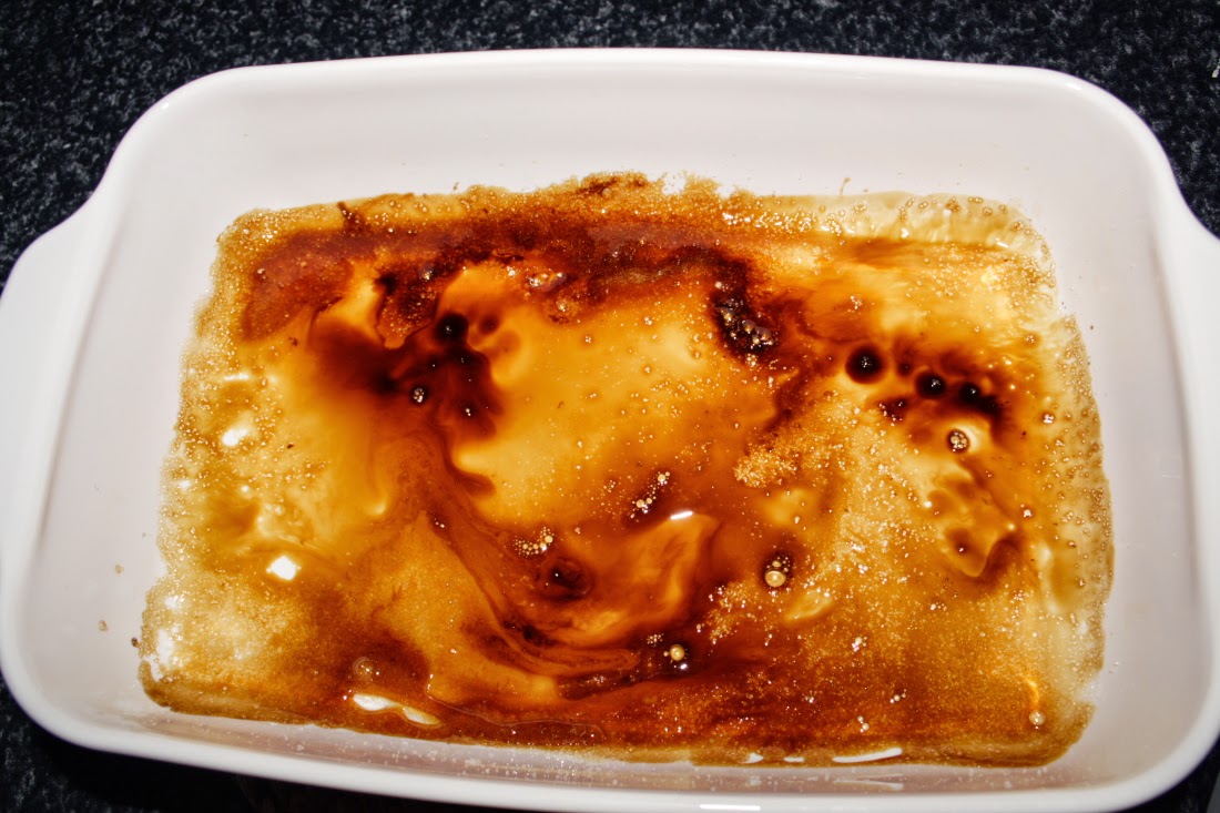 En un molde para horno, si es rectangular mejor, ponemos las dos cucharadas soperas restantes de azúcar, el chorrito de limón y lo ponemos sobre el fuego, para hacer el caramelo (este paso lo podéis ahorrar y usáis sirope de caramelo).