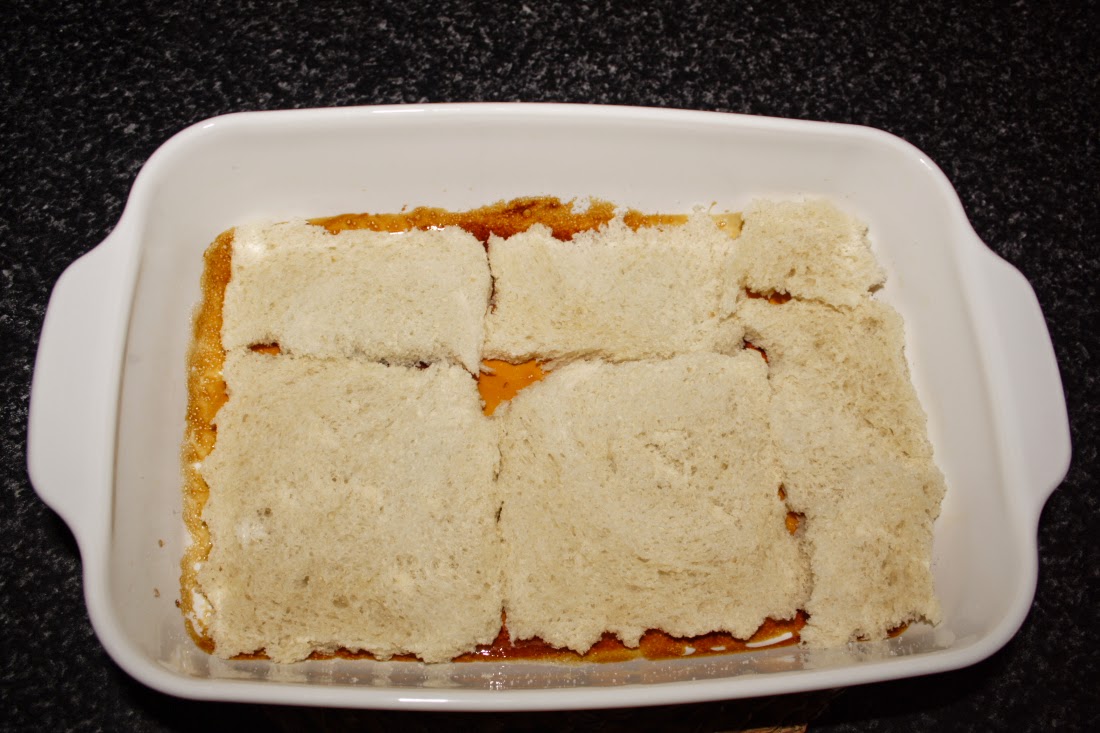 Al pan de molde le quitamos la corteza, cogemos cuatro rebanadas las cortamos de tal manera que cubra el fondo del molde con el caramelo y vertemos sobre él la mezcla anterior, echar aproximadamente la mitad.