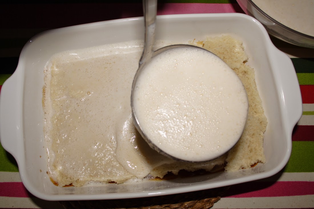 Cuando el pan se haya empapado, añadir otra capa de pan, con las cuatro rebanadas restantes y verter el resto de la mezcla. Parecerá que el pan flota, pero no importa. Ponemos el pudin en otro recipiente con agua para que se haga a «baño María» (cuidado no llenar mucho de agua este recipiente, porque al hervir se puede meter agua al pudin) y lo metemos en la parte inferior del horno a 170º C, calor arriba y abajo, durante 35 minutos.