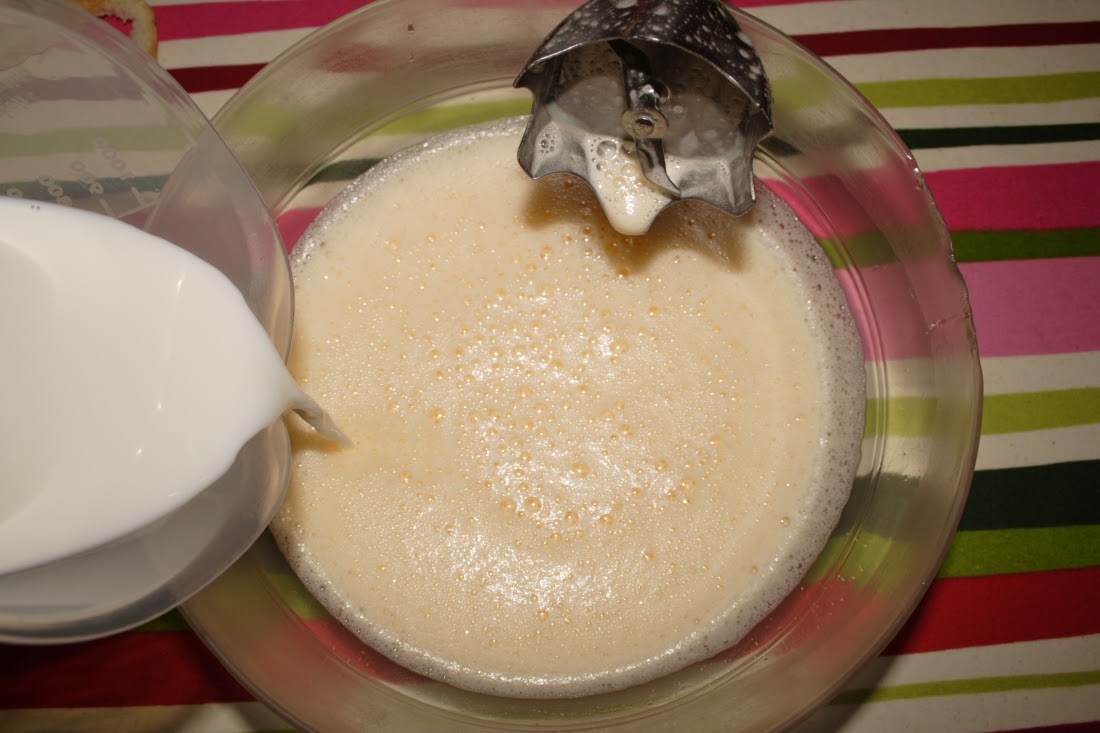 En un bol batimos los huevos con el azúcar durante unos 5 minutos. Añadimos la leche y seguimos batiendo hasta que la mezcla quede homogénea.