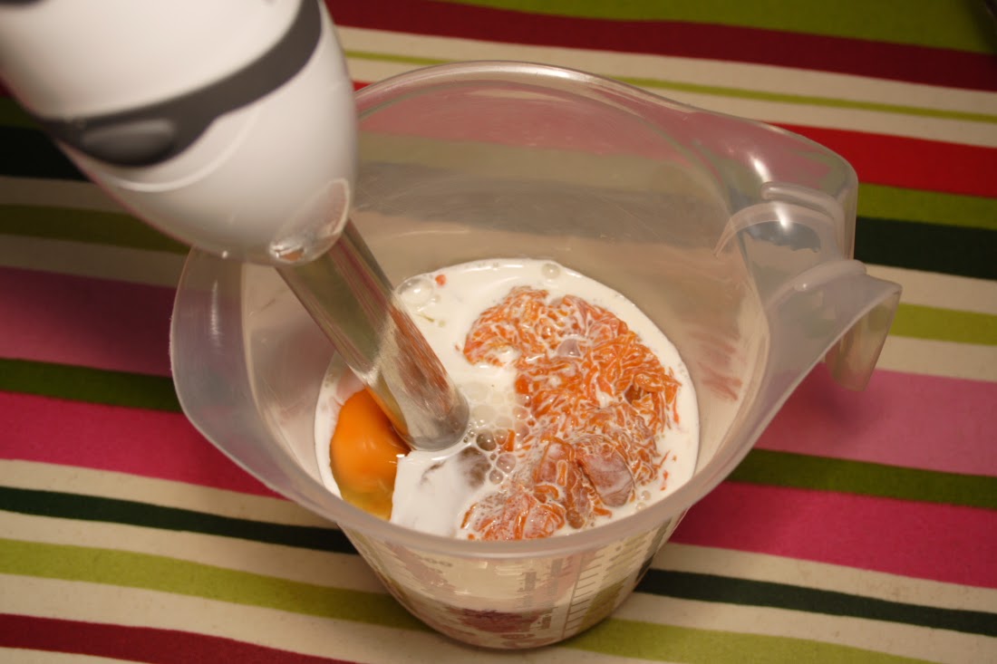 Quitamos los clavos y la ponemos en un vaso batidor con los huevos, la nata y el resto del azúcar blanco. Batimos todo hasta conseguir una crema homogénea, mas líquida que espesa.