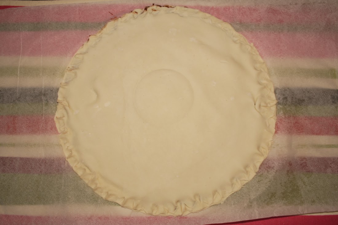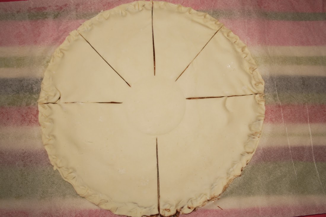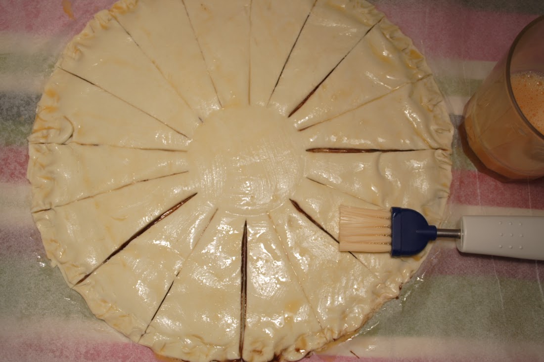Una vez hecho esto, cogemos un vaso, lo colocamos en el centro de la tarta y presionamos muy ligeramente, lo justo para hacer una marca y pincelamos con el huevo batido toda la superficie.