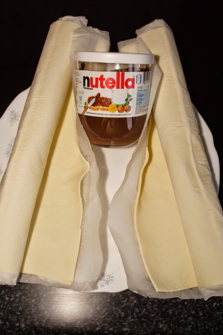 Una vez recortada, la dejamos de nuevo sobre el papel de horno que trae y la untamos con la crema de cacao, procurando repartirla bien y dejando como un centímetro sin crema en los bordes.
