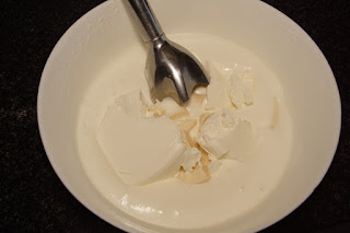 Ponemos el brick de nata en un bol con hielo y lo metemos en la nevera, por lo menos una hora antes de ponernos con la receta.