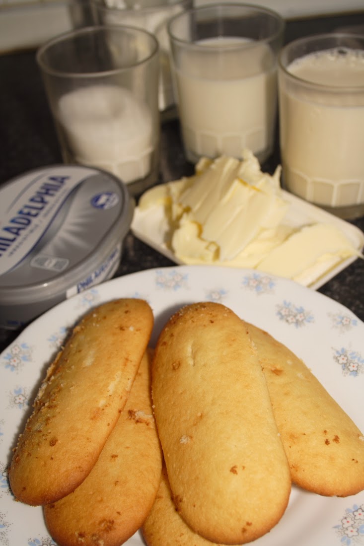 En un vaso (de los de duralex) echamos leche hasta la mitad y un chorrito de ron. Con la ayuda de una cuchara vamos empapando los bizcochos con el fin de que la tarta quede mas jugosa.
