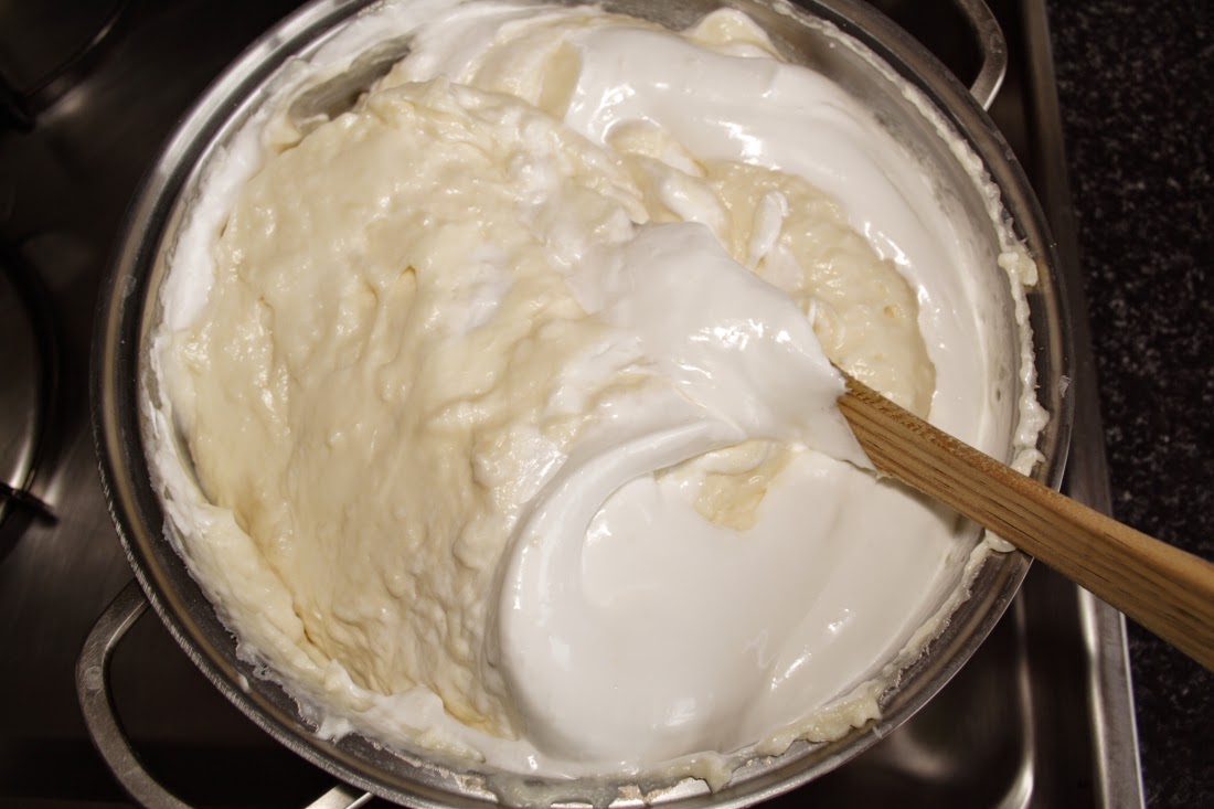 Con el fuego apagado, añadir muy lentamente las claras montadas con el azúcar, mezclar todo bien, con movimientos envolventes.