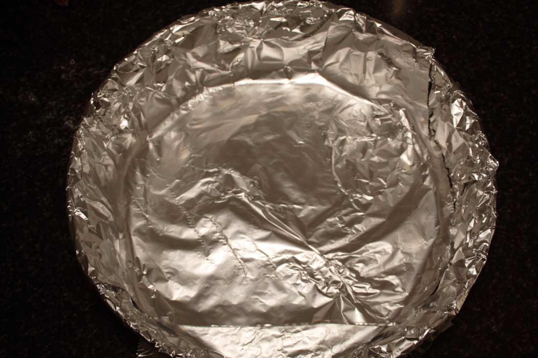 Forramos con papel de aluminio un molde desmoldable, (si ya sabéis que el molde pierde líquido por debajo, forramos también por fuera.).