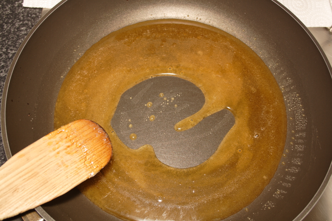 En una satén amplia, echamos las cucharadas de azúcar, las gotas de limón y el chorrito de agua. Ponemos a fuego no muy fuerte y cuando veamos que empieza a dorar removemos con una espátula, procuraremos que no nos quede demasiado oscuro porque sino amarga.