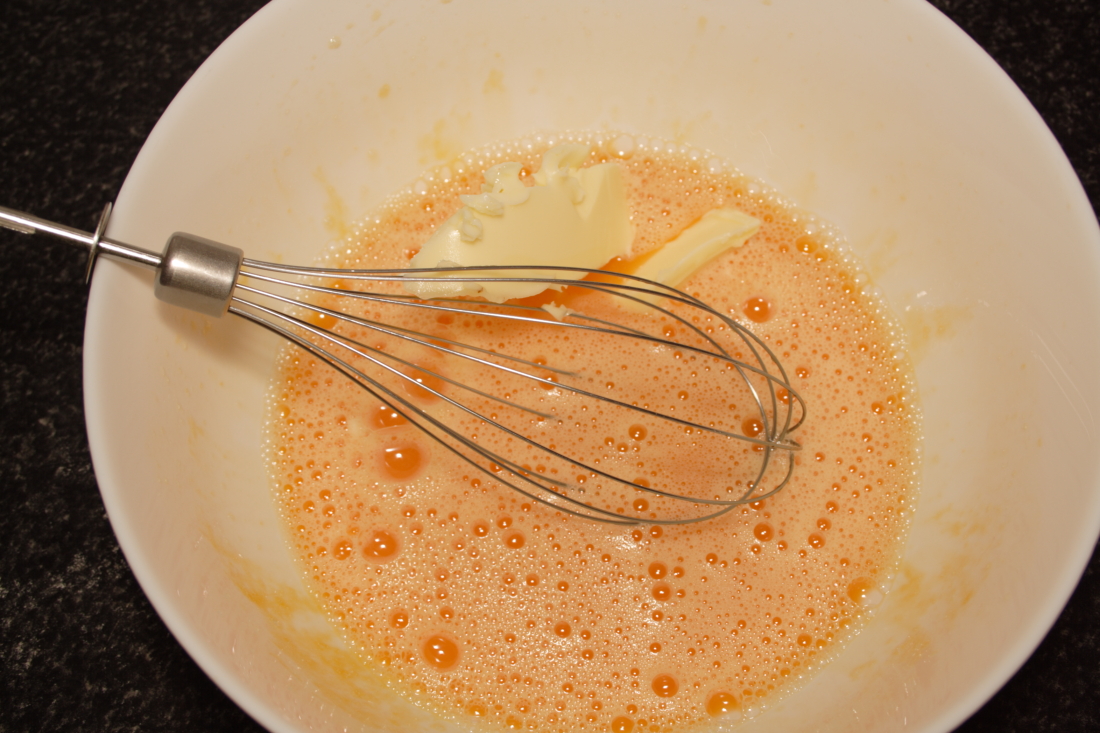 En un bol ponemos los huevos y el azúcar, batimos con las varillas y la batidora. Cuando este todo bien batido añadimos la mantequilla a punto pomada (la calentamos en el microondas pero sin que se derrita). Seguimos batiendo con las varillas. Incorporamos el coco y seguimos batiendo.