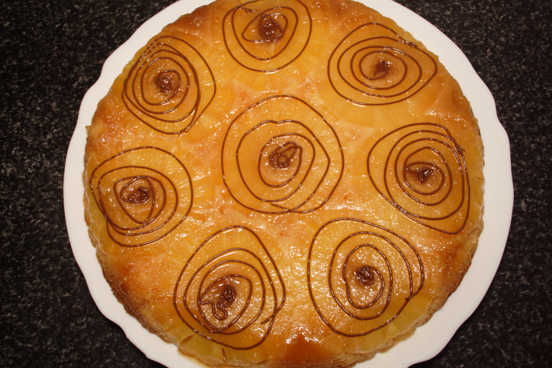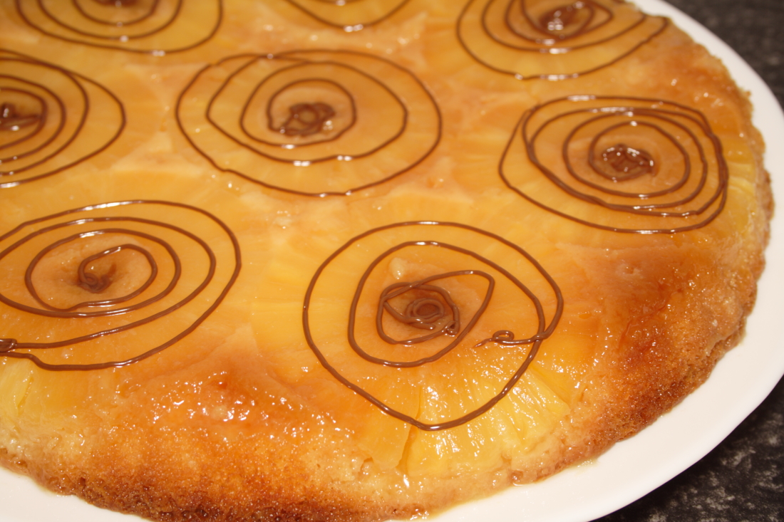 Untamos muy bien el molde con el caramelo líquido, con la ayuda de una brocha, de forma que untemos también los bordes. Disponemos sobre el caramelo las rodajas de piña (que serán unas 8) y reservamos.