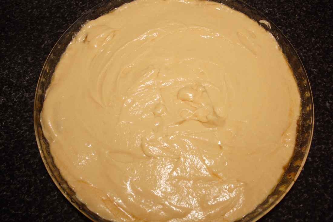 Y todo ello lo echamos en el molde, sobre la piña. Extendemos bien con ayuda de una lengua de cocina, que quede todo plano. Metemos en el horno a 170ºC, calor arriba y abajo, durante 30 minutos.