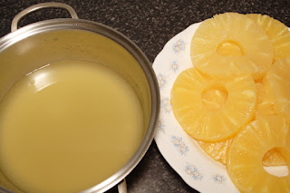Sacamos las rodajas de piña del jugo, y lo reservamos.