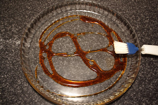 Con ese palo de la brocheta la pinchamos por toda la tarta y con ayuda de una cuchara, vamos vertiendo el jugo y el ron, despacio, que lo chupe bien. Reservamos 1/4 del jugo para terminar de empaparla cuando se enfríe.