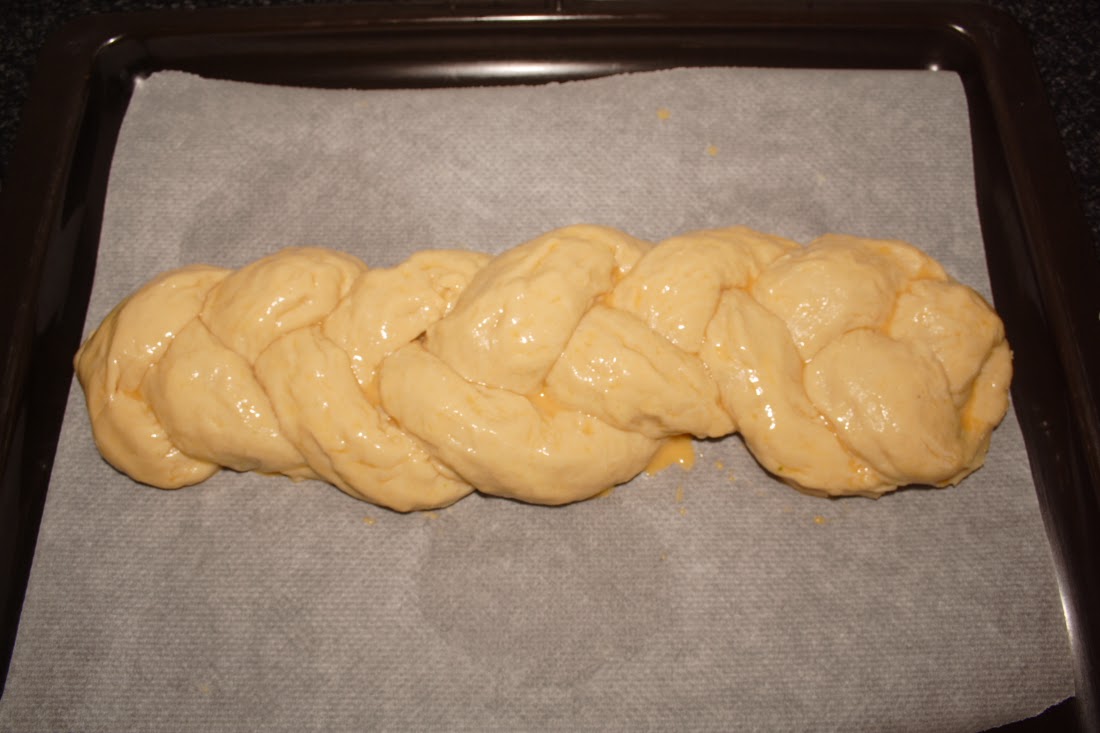 Pasado este tiempo, volvemos a untar la encimera con aceite y convertimos las bolas en barras largas, para hacer la trenza. Sobre la bandeja con el papel de horno, hacemos nuestra trenza uniendo bien los extremos y trenzando de la manera mas uniforme para que nos quede una trenza bonita. Pintamos con el huevo de forma generosa, metemos la bandeja en el horno sin encender, cerramos y la dejamos reposar hasta que doble casi su tamaño.