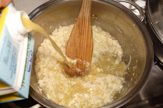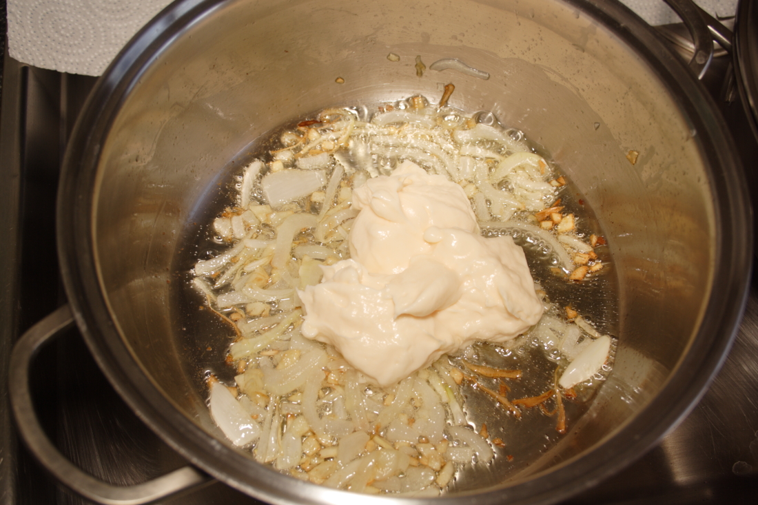 Cuando se doren, añadimos la mayonesa, removemos para que se mezcle y vertemos el caldo.