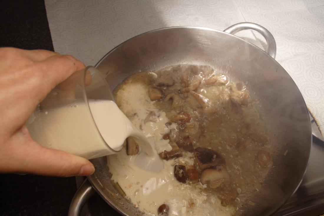Ponemos al fuego una olla baja y ancha, vertemos aceite de oliva y pochamos la cebolleta, que no se nos queme y añadimos las setas, salpimentamos y cuando se ablanden añadimos la leche evaporada.