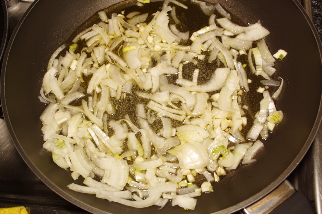 En una sartén, ponemos aceite de oliva y pochamos la cebolla y el ajo, una vez dorados añadimos los pimientos (el rojo y el verde) y el laurel, dejamos que se rehoguen.