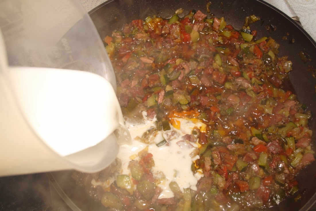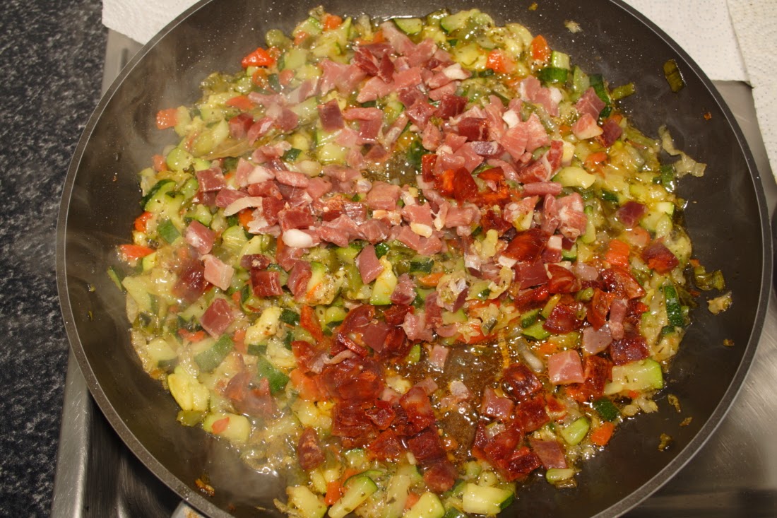 Añadimos el calabacín y seguimos rehogando, cuando esté todo bien hecho, añadimos el jamón y el chorizo. Espolvoreamos con pimienta y orégano.
