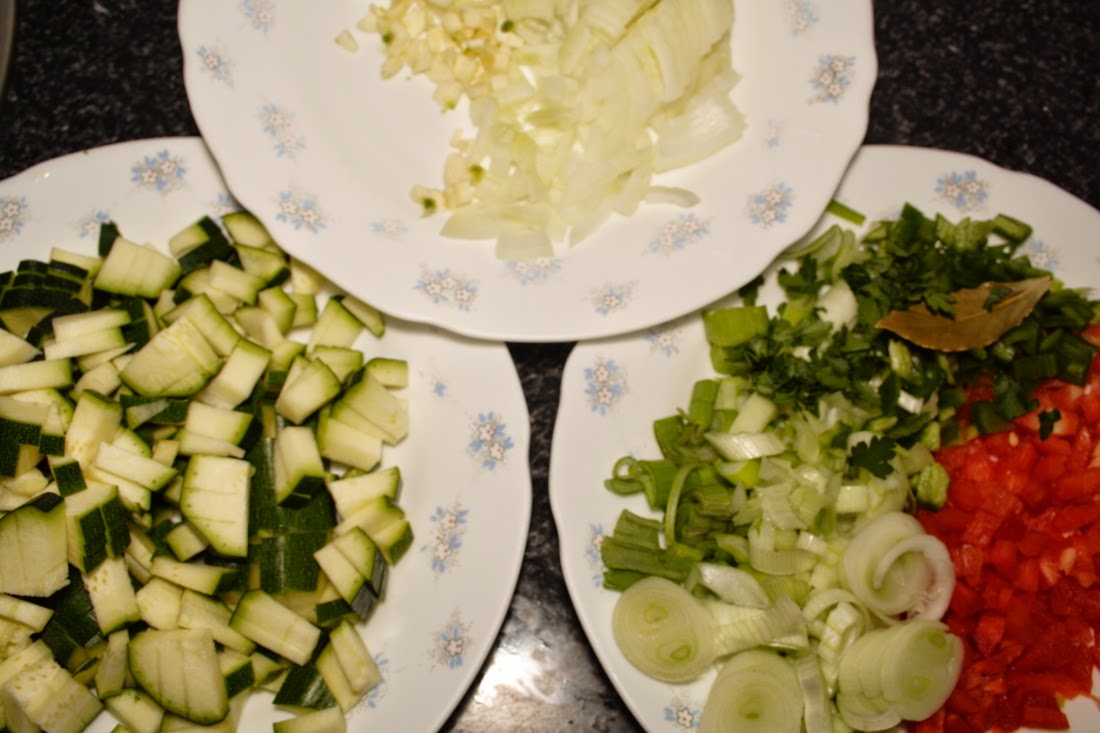 Lavamos las verduras. Pelamos el pimiento rojo y troceamos todas las verduras en dados no muy grandes. Dejamos el calabacín con piel. Picamos el chorizo y el jamón en dados pequeños y reservamos.