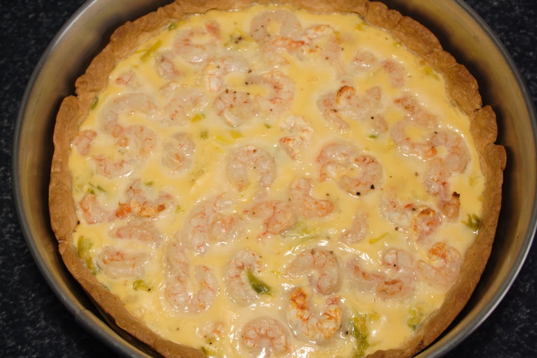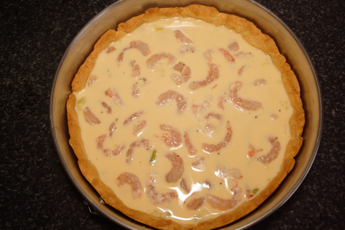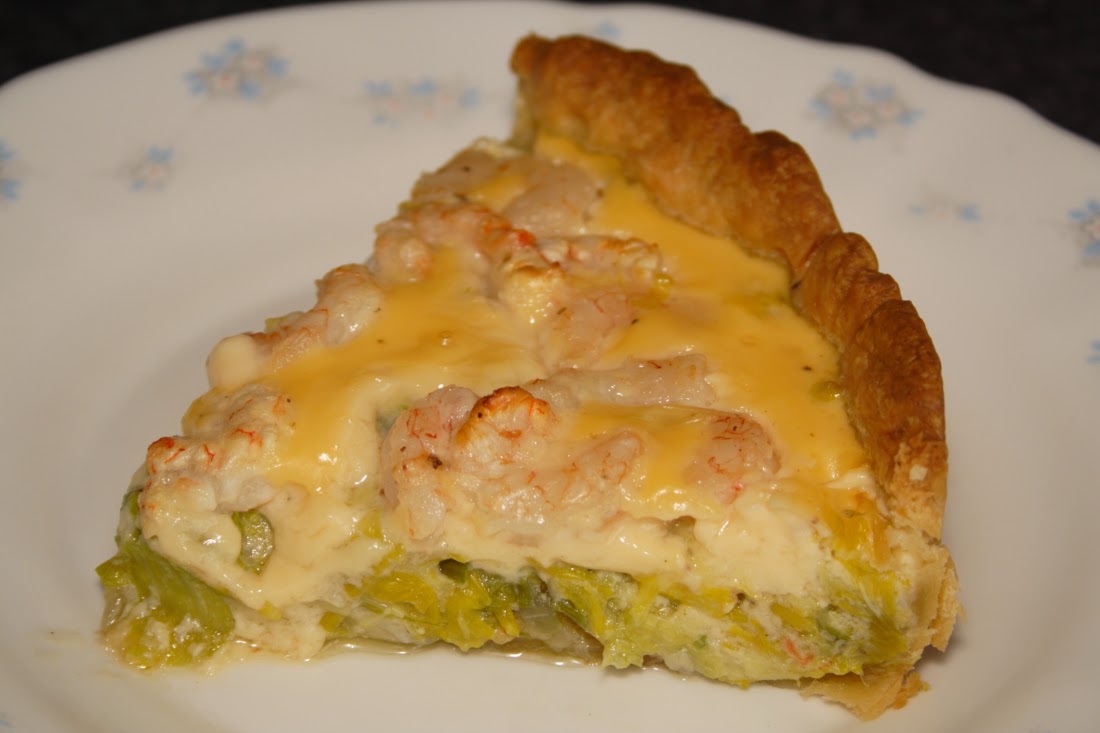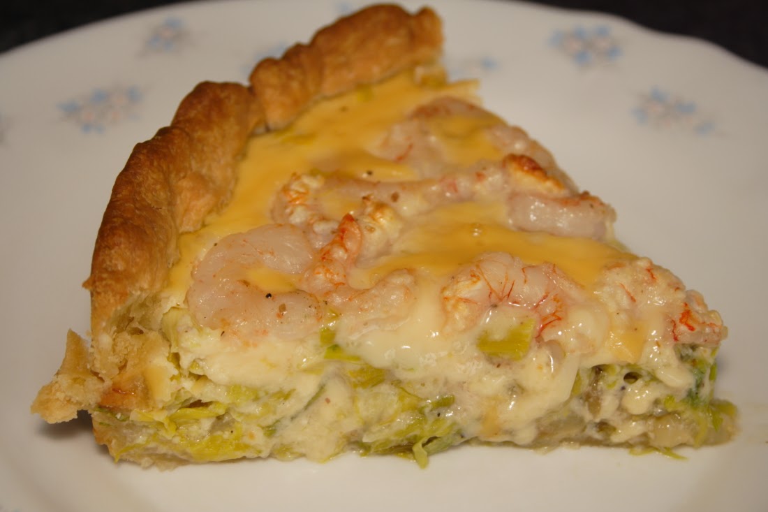 Ahora ponemos nuestro relleno, bien en las tartaletas individuales o bien en el molde grande. Distribuimos bien la cebolla y las porretas en el fondo, rellenamos con el puerro, repartimos las gambas y cubrimos todo ello con la crema. Horneamos a 190ºC, calor arriba y abajo, durante 35 minutos.