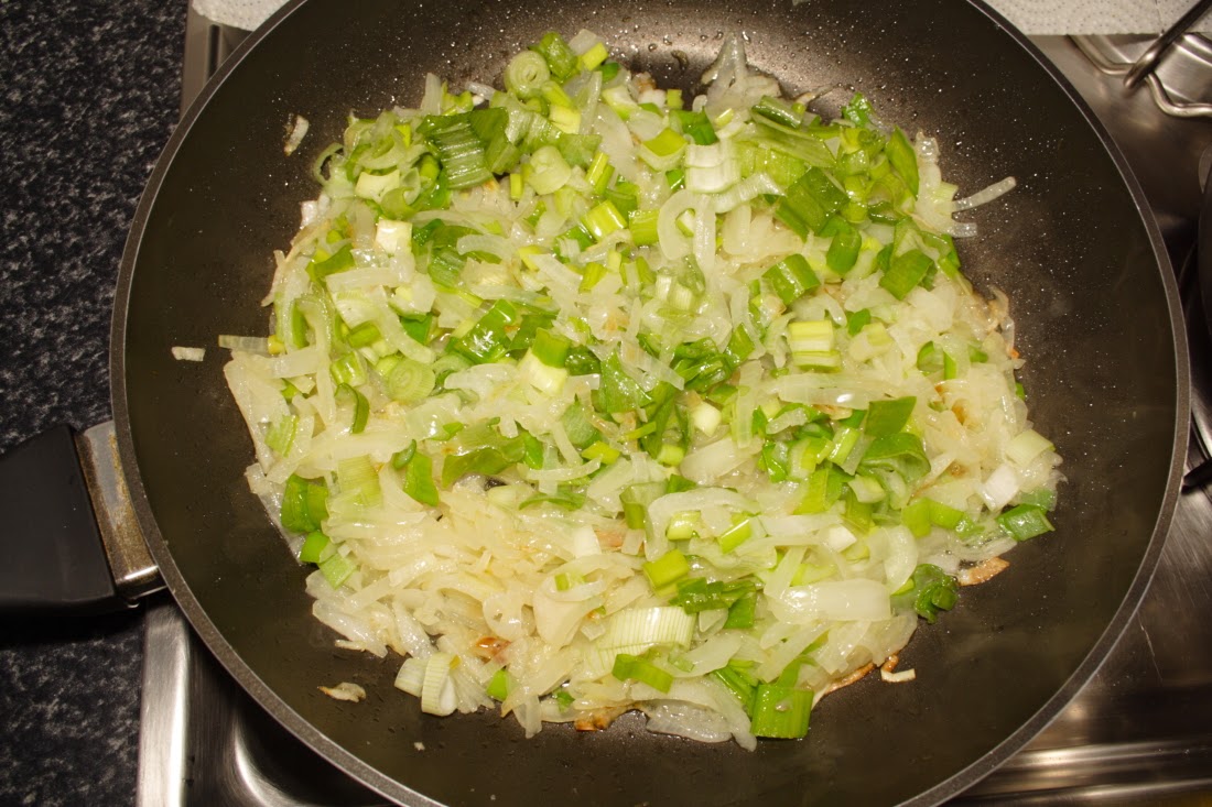 En una sarten ponemos a dorar los piñones (sin aceite), cuando estén dorados, sacamos y reservamos.Limpiamos la cebolla y las porretas y las troceamos finamente, en la misma sarten donde hemos puesto los piñones, vertemos aceite de oliva, pochamos la cebolla con una pizca de sal. Una vez pochada añadimos las porretas. Cuando estén hechas, reservamos.