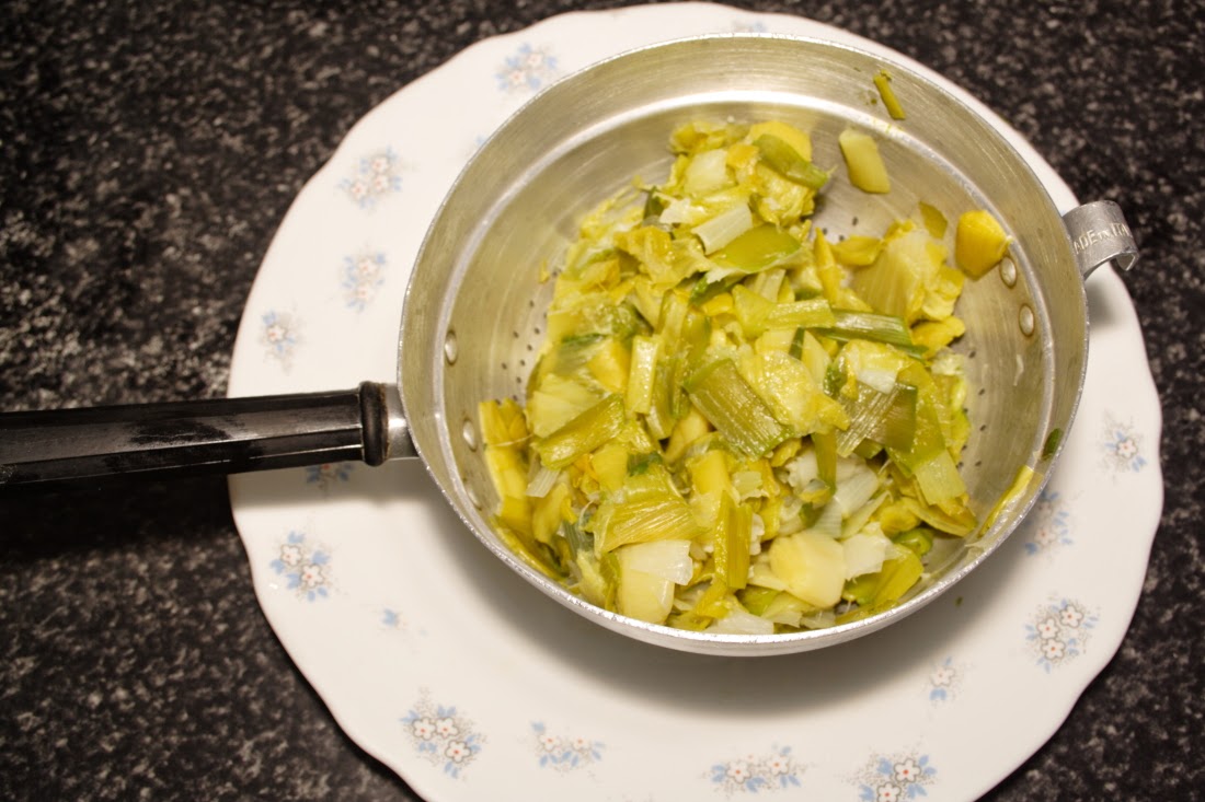 Mientras reposa la masa, limpiamos los puerros, los picamos y ponemos a cocer en una olla con agua hirviendo y sal. Una vez cocidos, escurrimos y reservamos.