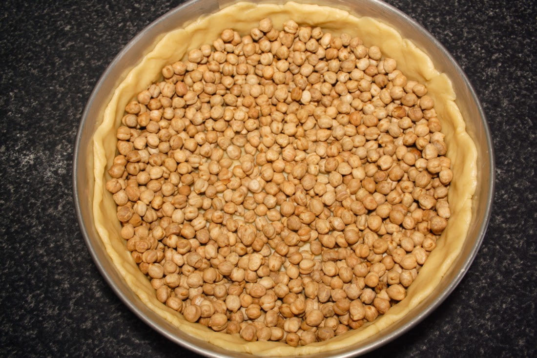 Después del reposo, estiramos la masa con ayuda de un rodillo o botella. Si habéis elegido moldes individuales (deben ser desmoldables), repartimos la masa en los cuatro moldes forrándolos bien y quitando lo sobrante de masa. Yo he elegido un molde grande. Ponemos garbanzos en el molde para que la masa no suba en el horno. Horneamos nuestra masa a 180ºC, calor arriba y abajo durante 30 minutos. Pasado este tiempo sacamos del horno y reservamos.