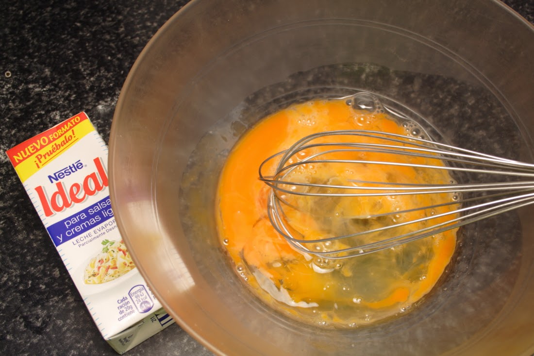 Para hacer la crema, en un bol casamos dos huevos, batimos, incorporamos la leche evaporada, la pimienta, la sal, mezclamos bien y reservamos.