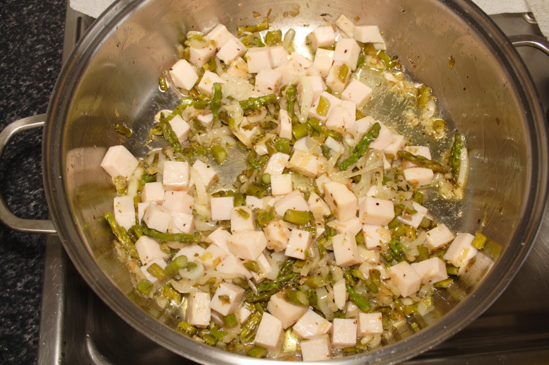 En una olla con aceite de oliva, ponemos los espárragos a pochar. Cuando estén tiernos añadimos las cebolletas y el ajo, salpimentamos y dejamos que se poche todo bien.