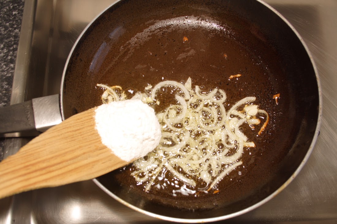 En una sartén, pochamos la cebolleta cortada fina, añadimos una cucharada sopera colmada de harina, removemos bien para que se haga, añadimos una pizca de nuez moscada y vertemos la leche poco a poco, que no nos quede muy líquida la besamel y sazonamos.