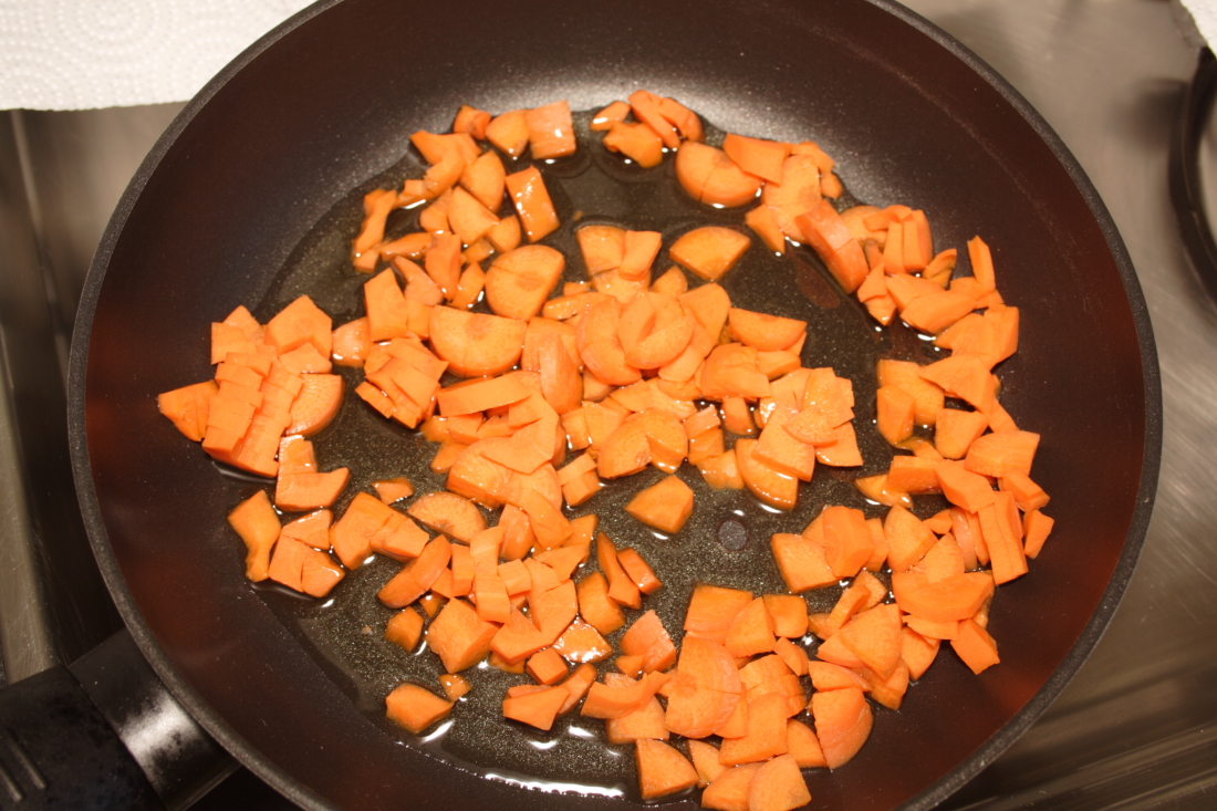 En una sartén, echamos un chorro de aceite de oliva y pochamos la zanahoria (en la receta original va cocida), cuando esté dorada añadimos la cebolla y dejamos que se poche, sazonamos, retiramos del fuego y reservamos.