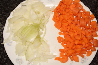 Pelamos los tomates, los cortamos en rodajas y reservamos. Lavamos la cebolla, pelamos las zanahorias y troceamos toco menudo. Reservamos.