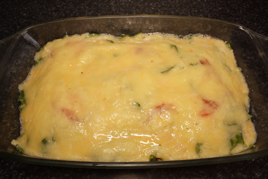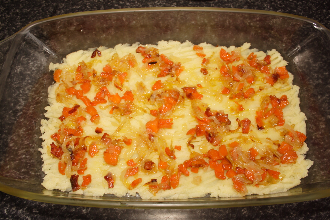 En nuestro molde untado, extendemos una capa, no muy gruesa de puré de patata, por encima repartimos la mitad de la zanahoria y la cebolla pochadas, cubrimos con la mitad de las hojas de espinaca y colocamos la mitad del tomate. Ponemos otra capa de puré…y lo mismo que antes. Yo le he puesto dos capas de relleno. Lo importante es que la última capa sea de puré.