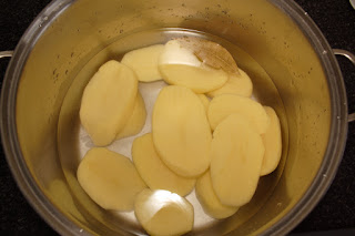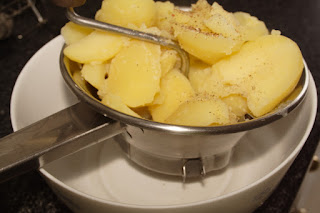 Pelamos las patatas y las troceamos, yo las corto en rodajas. En una olla vertemos agua, echamos las patatas, la hoja de laurel y ponemos al fuego para que hiervan, cuando lo hagan sazonamos. Una vez estén cocidas escurrimos y las pasamos por el pasapurés, añadimos la pimienta, el chorro de aceite de oliva virgen extra, mezclamos todo bien y reservamos.
